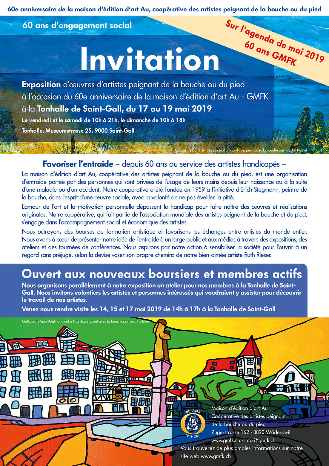 Un art exceptionnel créé par des personnes exceptionnelles : depuis maintenant 60 ans, la maison d'édition artistique Kunstverlag Au, coopérative d'artistes peignant avec la bouche ou le pied (GMFK), apporte son soutien aux artistes souffrant d'un handicap physique dans les domaines social et économique. Afin de favoriser les échanges entre les artistes eux-mêmes et avec la société, la maison d'édition organise régulièrement des expositions, des ateliers et des tournées de conférences. En mai, la maison d'édition célèbre son 60e anniversaire avec une exposition de trois jours suivie d'un atelier artistique. Du 17 au 19 mai 2019, de nombreuses œuvres d'artistes peignant avec la bouche ou le pied seront exposées à la Tonhalle de Saint-Gall.