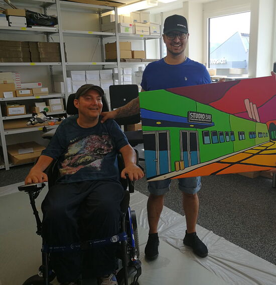 Ein Besucher der etwas anderen Art war der Musikproduzent und DJ Engin Colin Kilic. Der Musiker informierte sich über die Arbeit der Genossenschaft und nahm darüber hinaus das von Mundmaler Lars Höllerer für ihn angefertigte Gemälde «Studiobar» entgegen.
