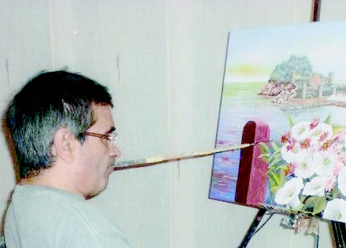 Bis ich es eines guten Tages entdeckte: Ich schenkte meiner kleinen Tochter, die zu diesem Zeitpunkt noch sehr klein war, Wasserfarben. Und sie sagte: "Papa, sieh mal, ob du besser zeichnen kannst als ich!" Es bereitete mir sehr viel Mühe, denn ich hatte sehr wenig Mobilität und konnte weder mit ihr spielen noch zeichnen. In diesem Moment erinnerte ich mich daran, dass es eine Vereinigung von Behinderten gibt, die mit einem Pinsel im Mund malen und es war der Moment, als ich dachte, warum ich es nicht auch machen sollte. Diese einfache Geste, den Mut zu haben, den Pinsel mit meiner Tochter im Mund zu halten, dieser kleine, jedoch grossartige Moment änderte mein ganzes Leben. Ich begann mit ihr zu zeichnen und es gefiel mir, was ich zeichnete.